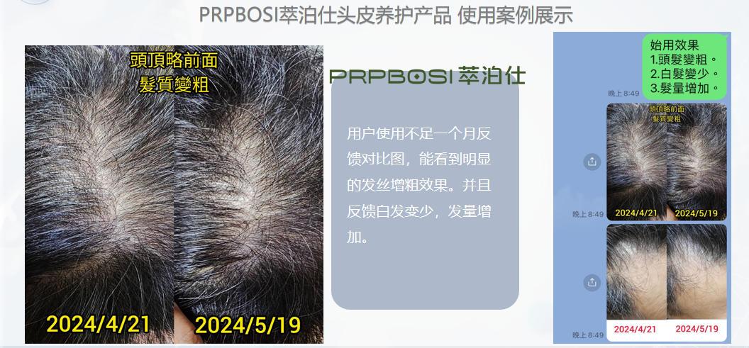 故事1. 42岁的程序员刘先生,长期熬夜加班让他头顶发质愈发细软,隐约可见头皮。2024年4月,他抱着“试试看”的心态开始使用萃泊仕头皮护理系列。他妻子在反馈中写道,“用了一段时间,发量变多肉眼可见,发质也明显变好了。” 对比图里,4月21日还稀疏贴头皮的发丝,到5月19日已明显蓬松,用指腹轻捏能感受到发芯的强韧。更让他惊喜的是,困扰多年的几缕白发竟悄悄转黑,发量肉眼可见地增加。